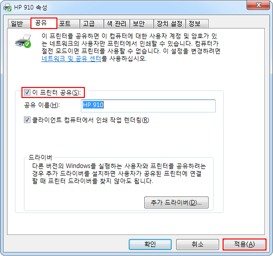 - C. ÇÁ¸°ÅÍ ¼Ó¼ºÃ¢¿¡¼ °øÀ¯ÅÇ -> ÀÌ ÇÁ¸°ÅÍ °øÀ¯ üũ -> Àû¿ë
